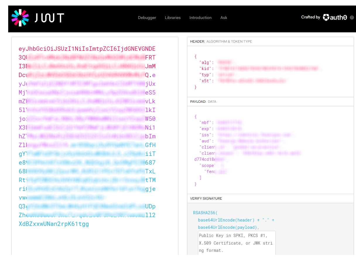 To inspect what this token is comprised of, simply visit: JWT.io. The token itself is not an encrypted string, it is simply a base64 encoded string and the contents can be viewed by base64 decoding. For security purposes and how the bearer token works, it must only be passed across HTTPS connections.