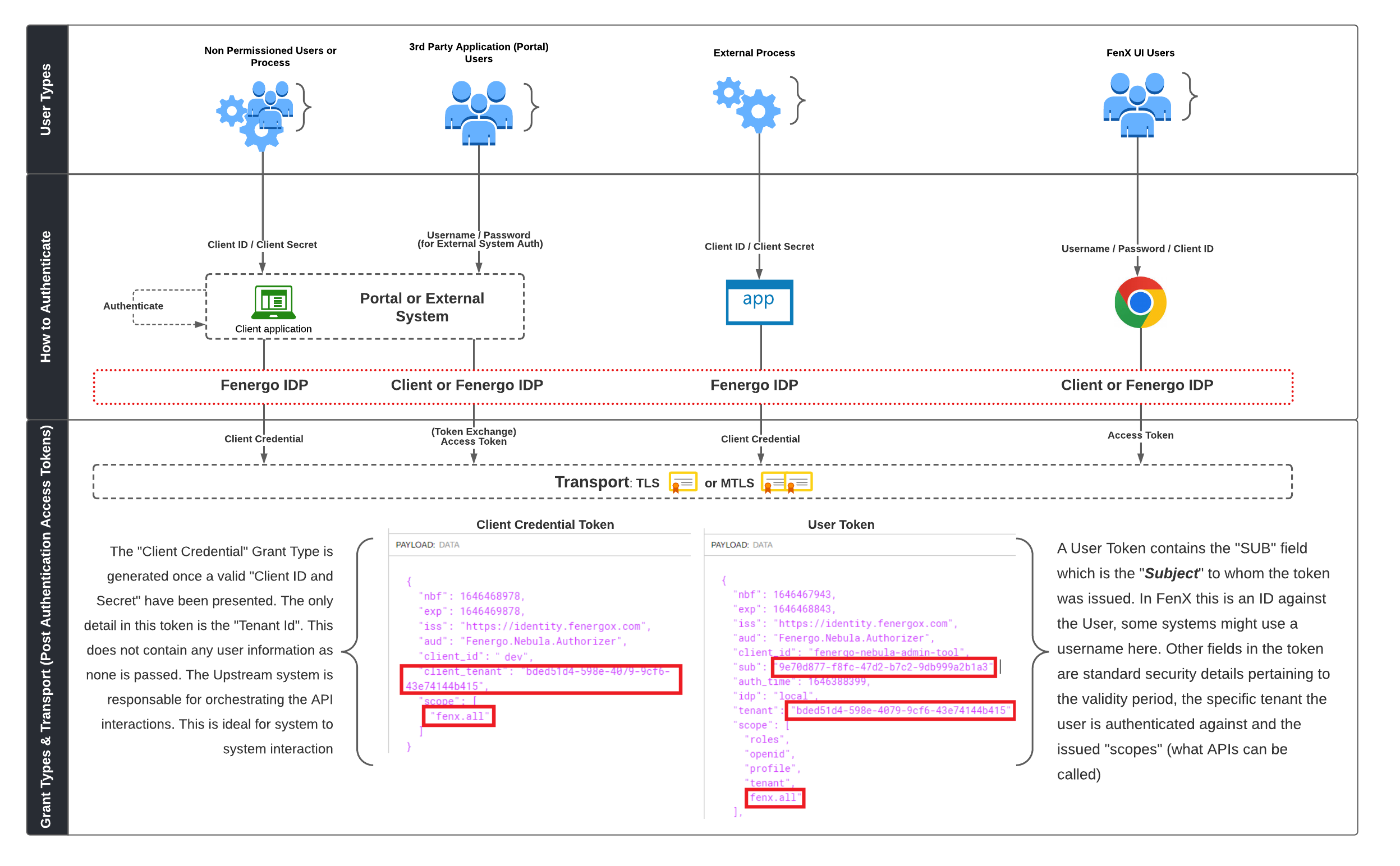 Each of these user types once Authenticated are issued an Access Token. That token is then presented for each subsequent API Call. Across the four user types, there are only two kinds of Access Token. One which identifies the underlying user and one which does not. Click here to learn more about Access Token Best Practice.