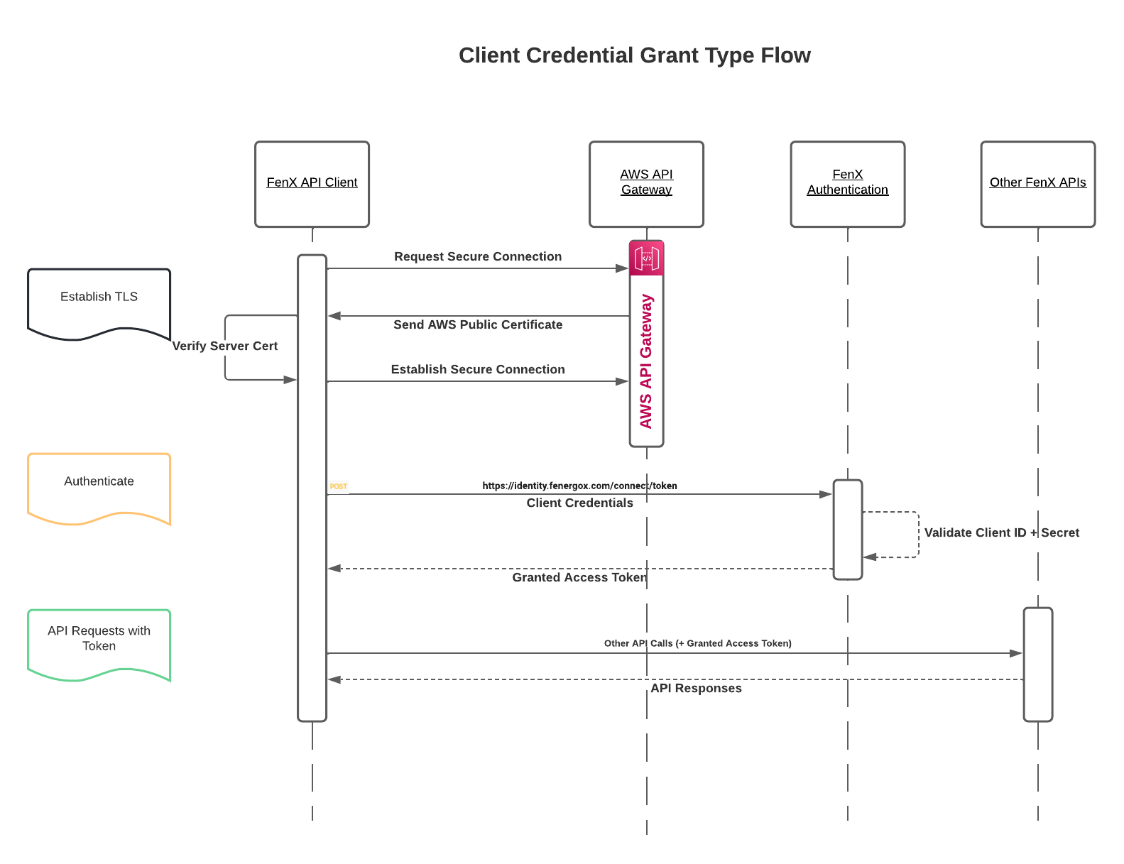 - A Client ID and Client Secret are sent to the FenX IDP for Authentication.