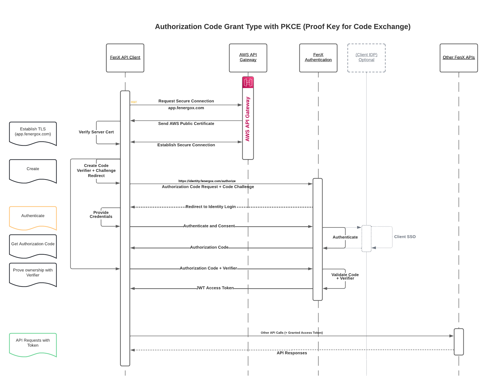 Code Challengeis sent to the/authorizeendpoint to start the request for anAuthorization Token. - The Authentication is performed with the credentials (This can be done with a clients IDP provider if required).