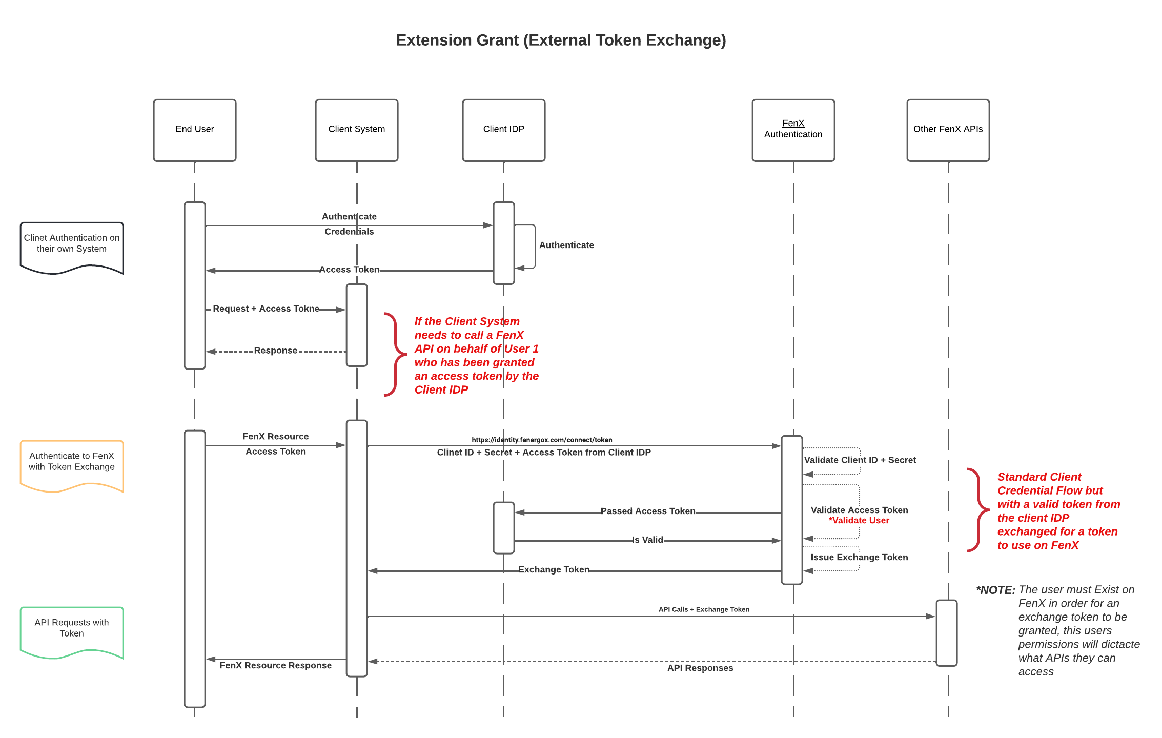 The assumption is that the user has already authenticated on the platform which is making the API calls, and the token they were issued is sent along with the preconfigured client-id and client-secret as per the client credential flow. Once the client credential flow is authenticated, the original users token is then "exchanged" for a FenX Token which can be used as if it were created using the Authorization Code Flow.