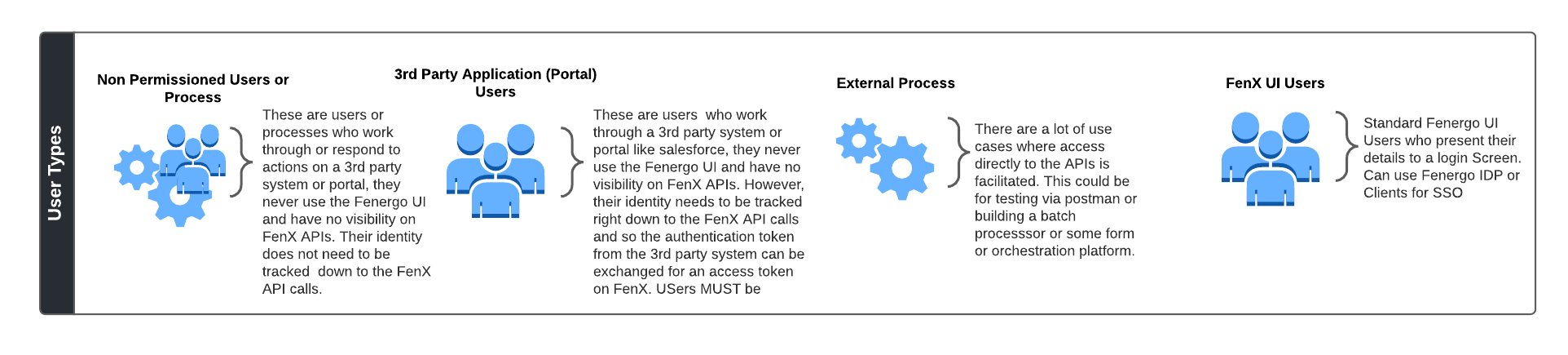 To decide how FenX clients should be configured to Authenticate, the types of user needs to be determined. There are broadly four separate categories of user type who will consume FenX APIs. As Illustrated below.