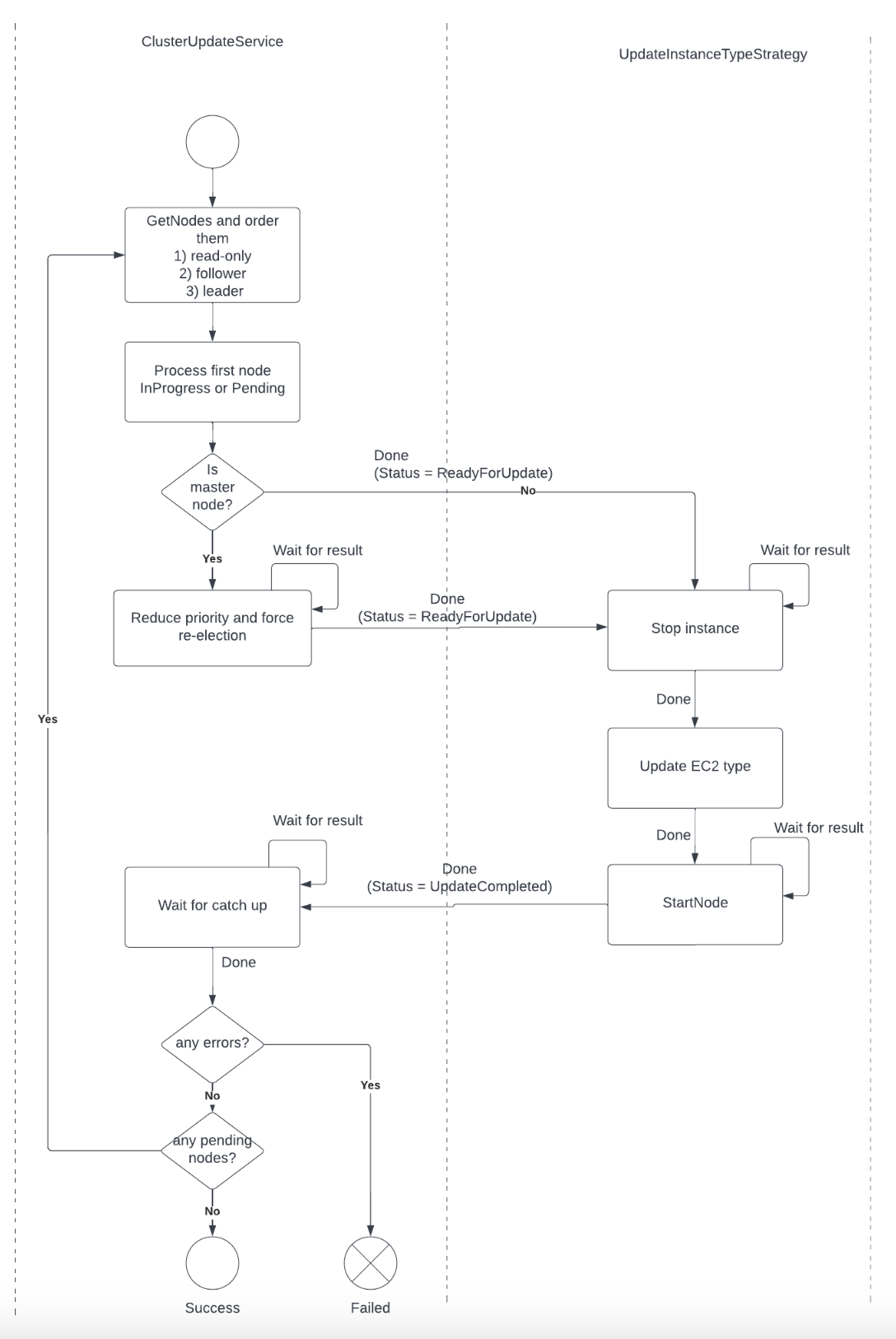 It is easy to maintain, test and extend. It simplifies the approach. To implement that process with one lambda per step, we would’ve needed more than 10 lambda functions. It is not coupled to step-functions. We could run the same process from any source, for example as an SSM automation. It gives us flexibility, since we can customize the current state and the lambda will continue the process. This can be handy if something goes wrong in the middle of the process and we want to resume it from the last valid state. Workflow and Extensibility In order to perform the update of the cluster, we have implemented an strategy pattern, so we can implement multiple types of updates for EventStore cluster. Then, we have two main classes: the class ClusterUpdateService that orchestrates the update across the nodes of the cluster, and the class UpdateInstanceTypeStrategy that implements how we update the type of an EC2 instance.