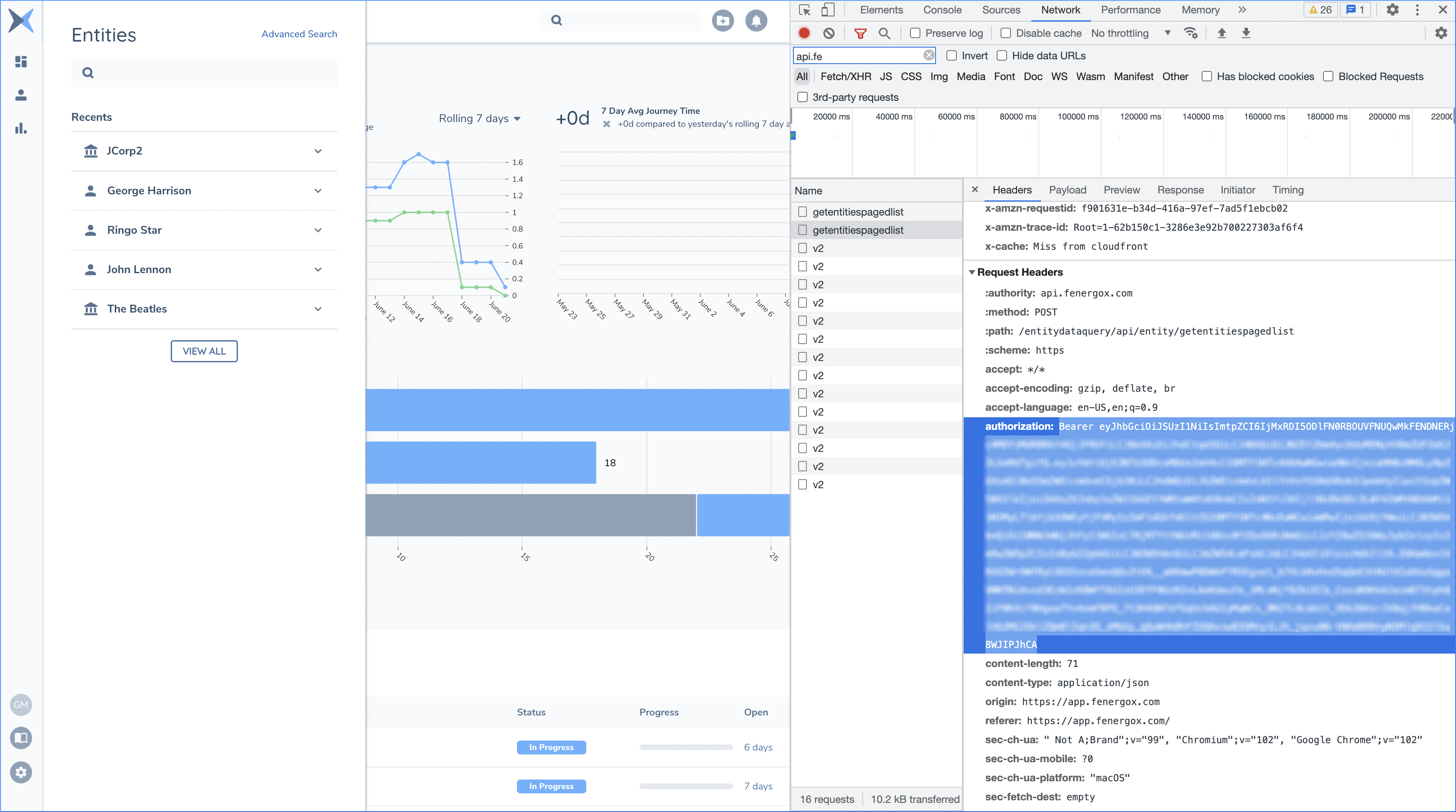 To get an access token, simply login to the Fenergo UI and bring up Developer Tools. On the Network Tab if you type into the filter api, it will filter the requests which have been sent to api.fenergox.com (replace this with the API endpoint for your region). Scroll to the bottom of the requests and you will see an Authorization header. Copy the entire value (including the word Bearer) and paste that into the Swagger Authorization Value.