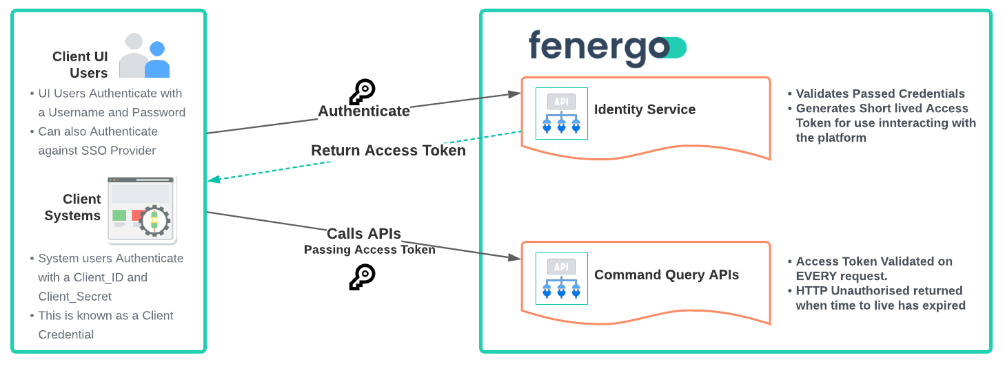 Before calling any APIs clients must first authenticate against the platform. It is best practice for API authentication to use Access Tokens in place of credentials such as usernames and passwords when making API calls. As illustrated below, a UI user or Client Integration first authenticates against the Fenergo Identity Server before making an API calls. The Identity server returns an access token and then the token is used as a substitute for live credentials in all subsequent API calls. Some key reasons as to why this is best practice are: