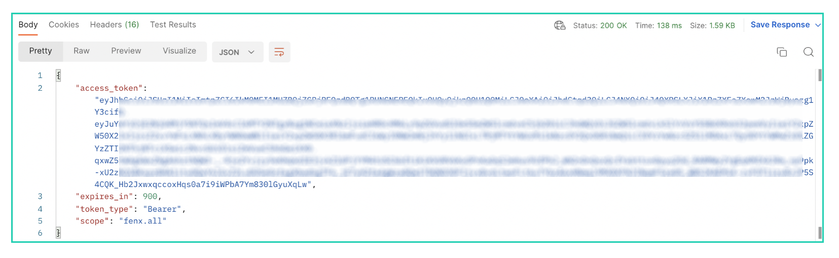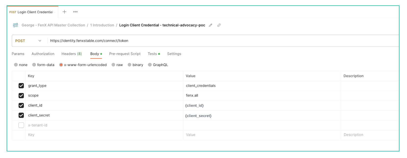 https://identity.fenxstable.com/connect/token(this will differ depending on the region you have chosen) - Body Form URL Encoded Values You will have to set the parameters as per the screenshot below.