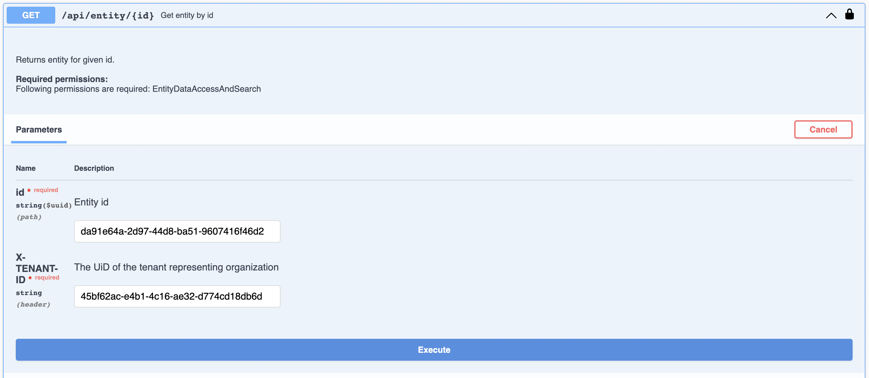 When you select the Try It Out button you must provide the Tenant Id and the parameters. This example the parameters are just an Entity Id.