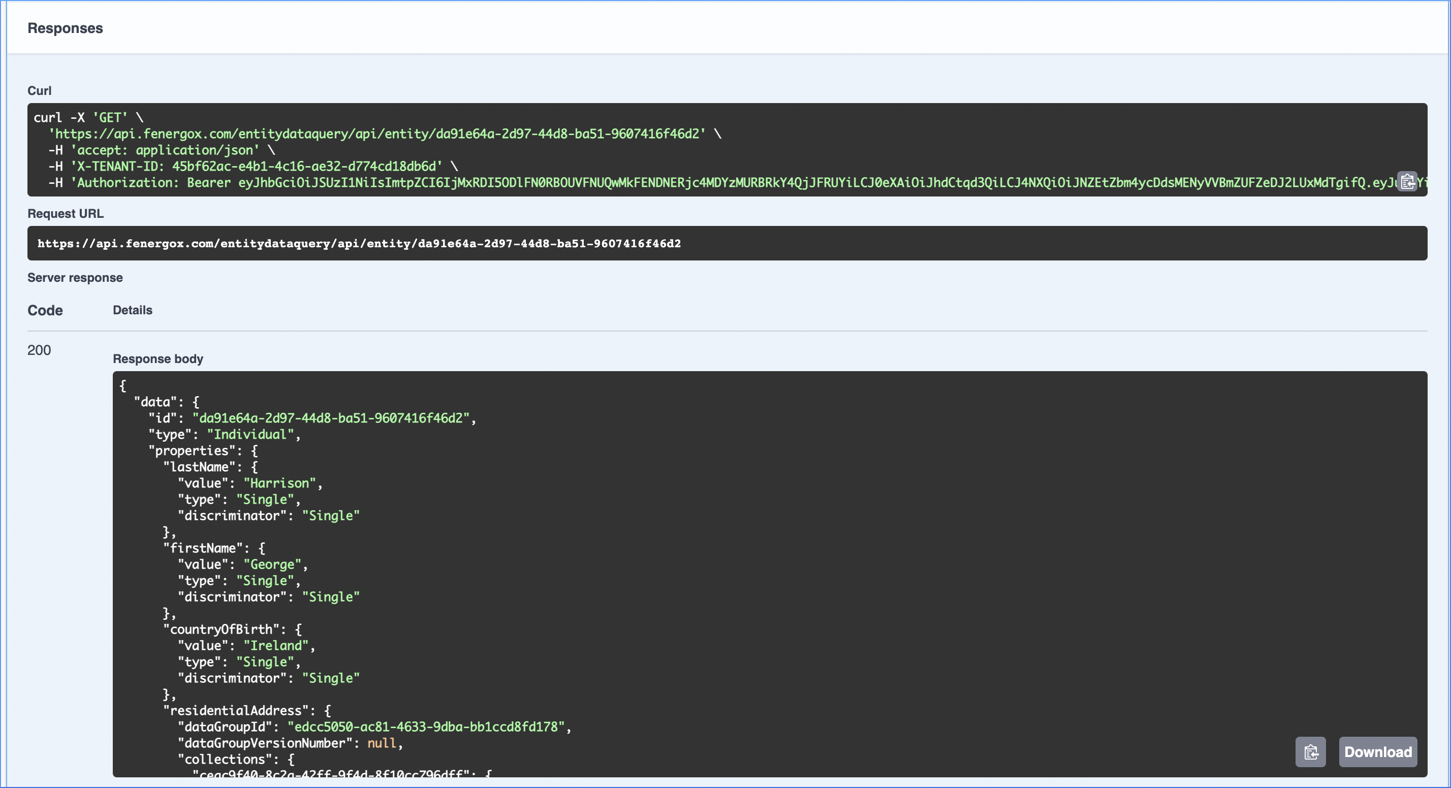 In the samples below, the access token is required to successfully make API calls. As described below, this can be retrieved from the developer tools in the Fenergo UI or requested directly from the Fenergo Identity Server.