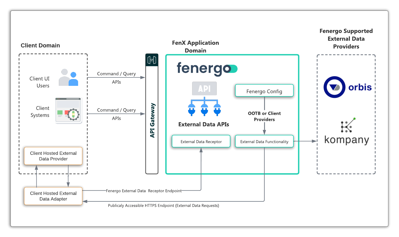 Consumers may need to use their own External Data Provider instead of those supported OOTB by FenX. For these situations, the Fenergo SaaS Platform allows consumers to setup an external adapter which they can host. That Adapter can then be targeted by the FenX application as an External Data Provider. That adapter must implement the agreed interface and will function just like the OOTB External Data Providers.