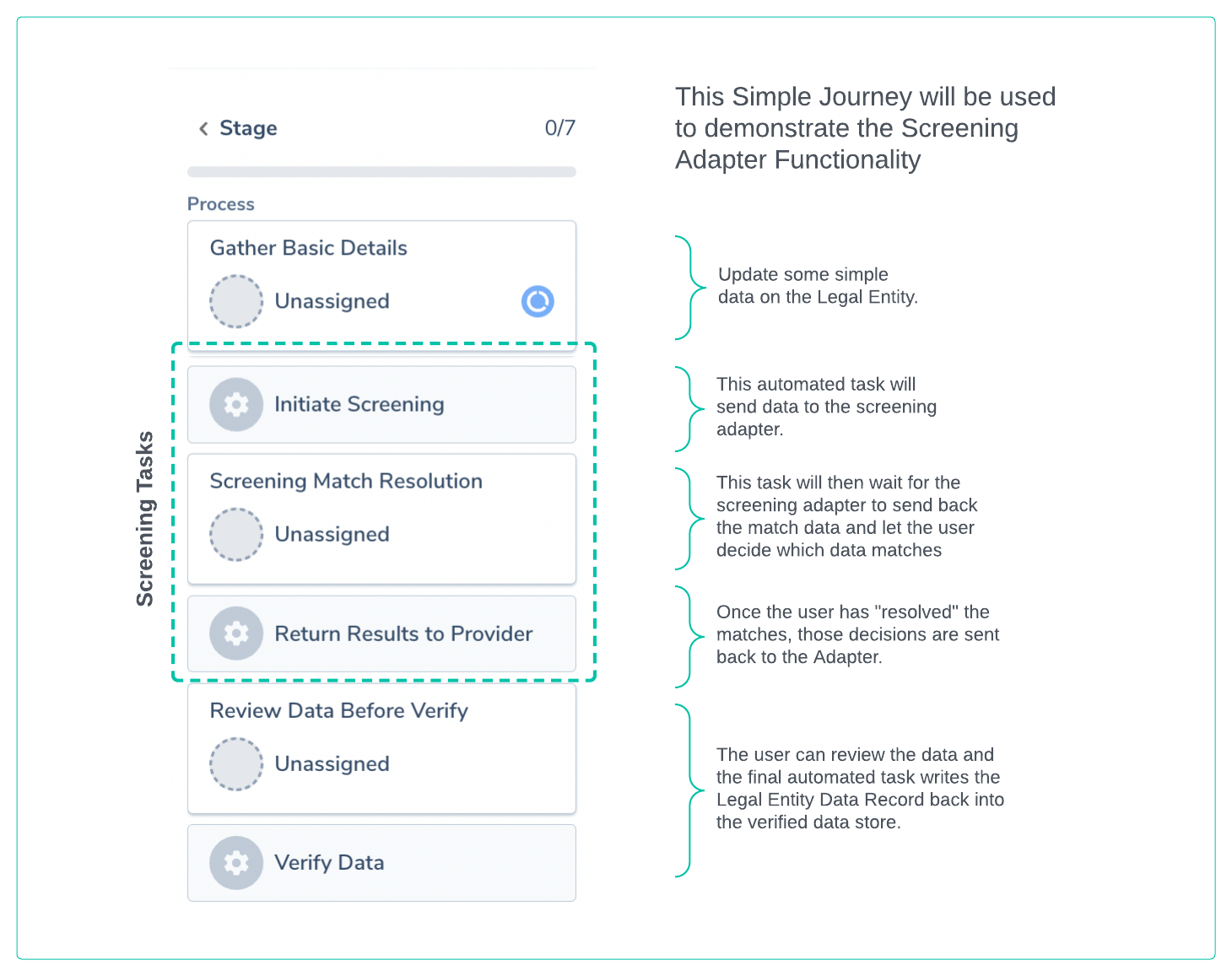 Once the custom screening adapter has been configured in Fenergo (and tested) it can then be used from within Journeys. What this means is that when a Screening Task is configured in a journey, Fenergo will send a Screen Request out to the configured providers. A correctly configured client implemented custom adapter will need to be capable of the following:
