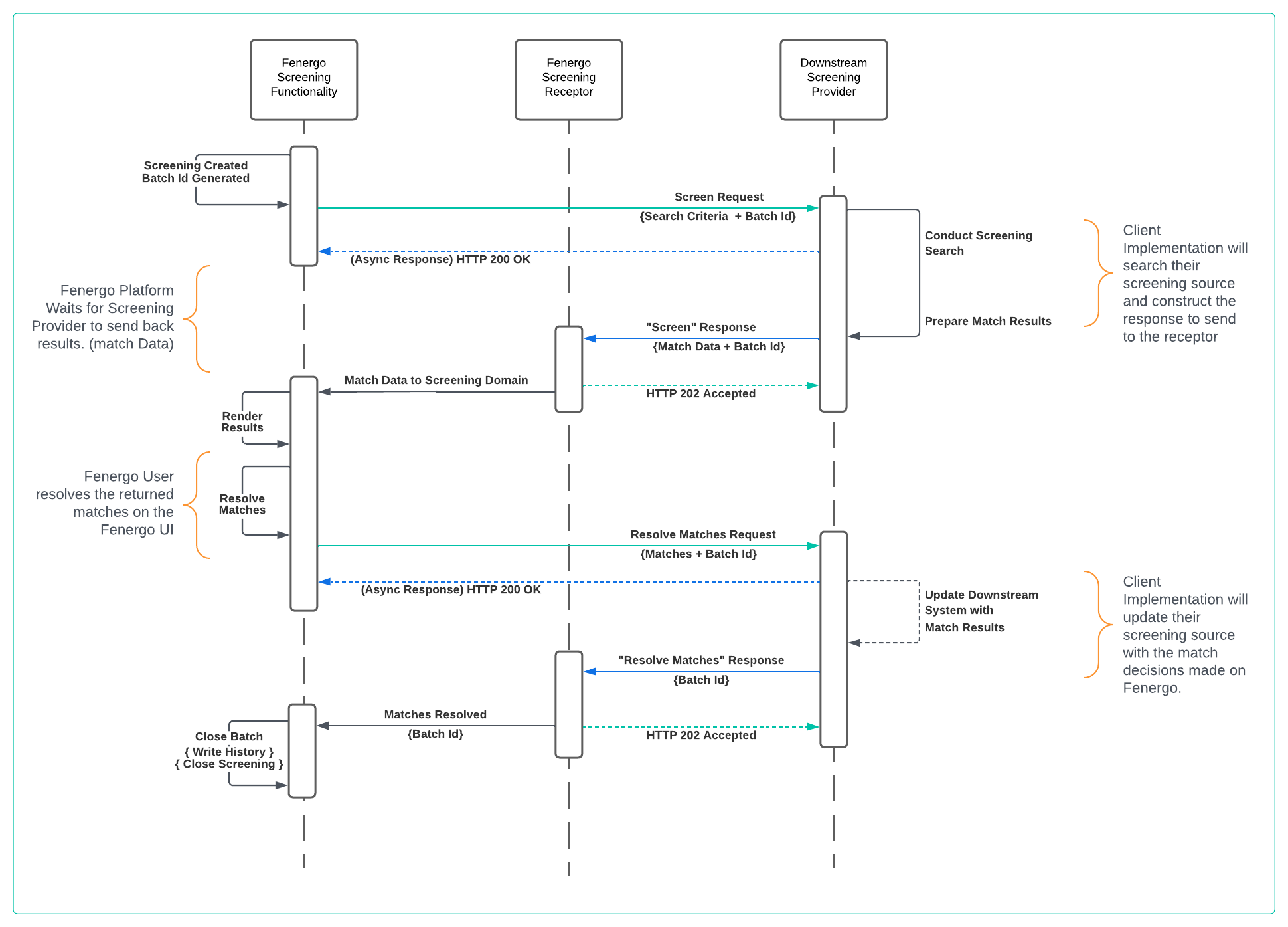 The last step in the process is for the clients custom screening provider to respond back to the Resolve Matches Request. This will close the open batch on the Fenergo platform.
