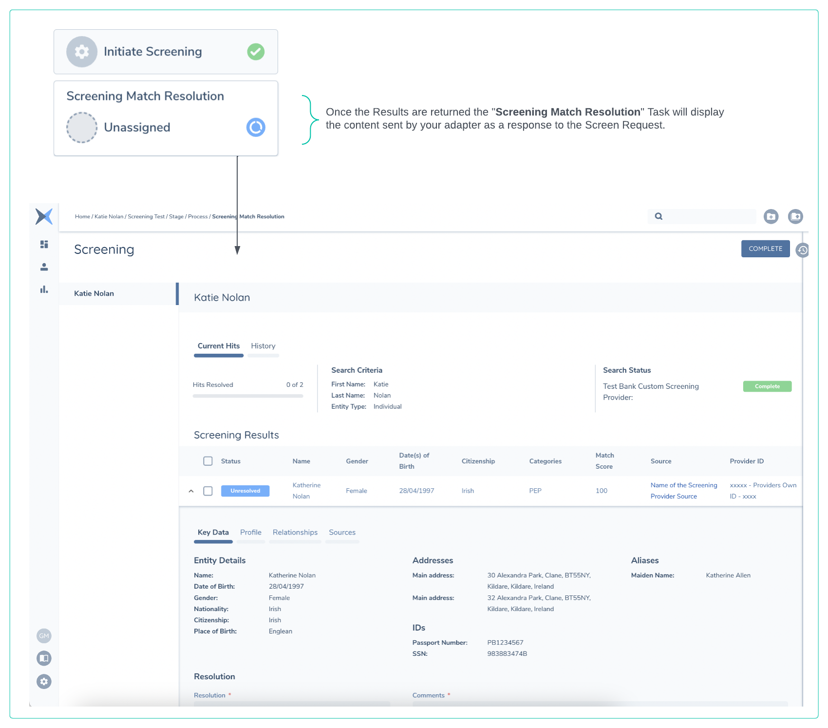 - Send the response to the Fenergo Receptor: With the message formed, the adapter will have to send a message back to the Fenergo Receptor endpoint. The match data will be ingested into the Screening task of the Journey and displayed to the users.