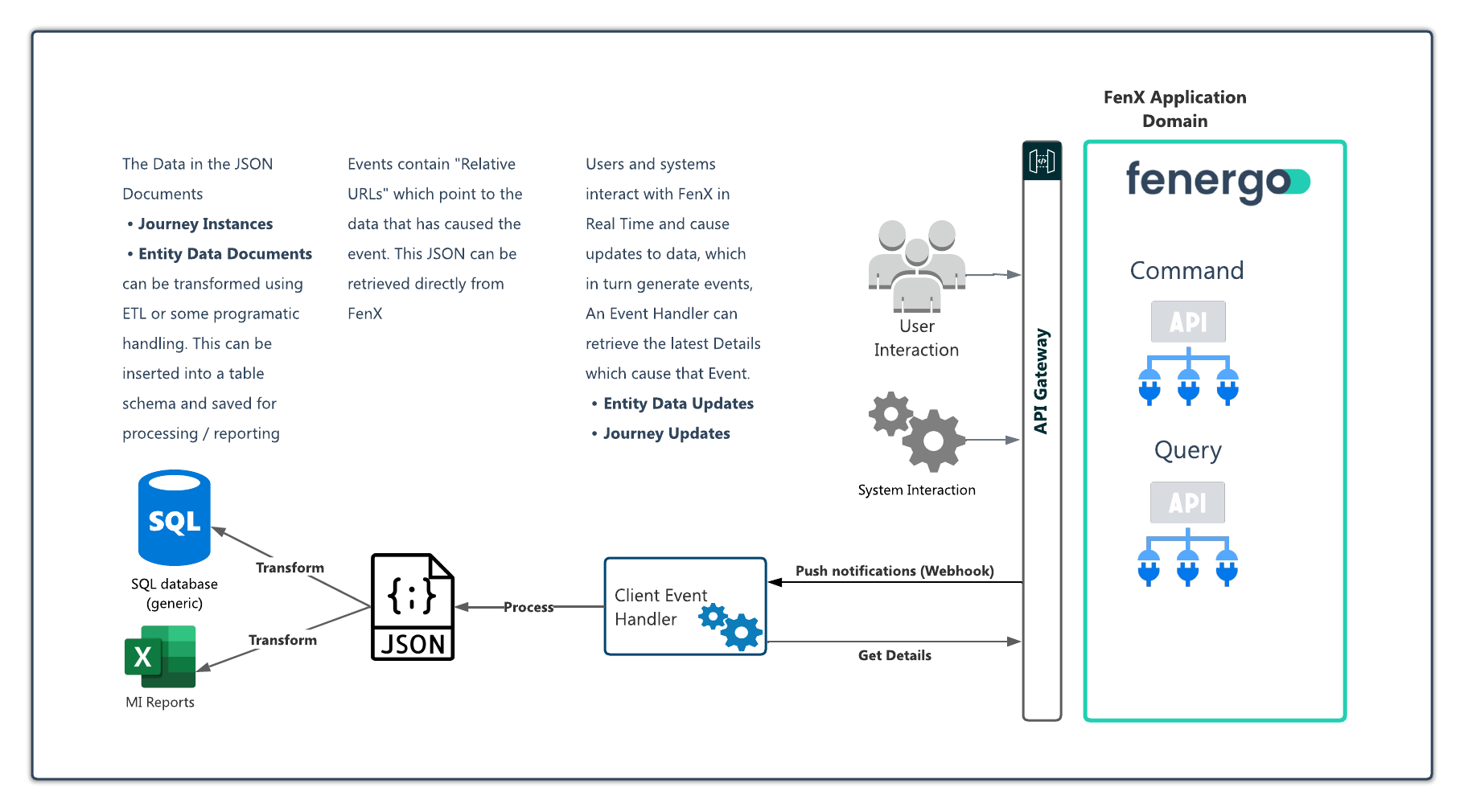 Fenergo is implemented using an Event Sourced CQRS Pattern (Command Query Responsibility Segregation). Across all the functional Domains we offer Command and Query APIs, where one API is used to create and update data, and a separate API is used to retrieve data. When a client Creates or changes any data on the fenergo SaaS Platform, an Entity, Journey etc... it will always return an identifier.