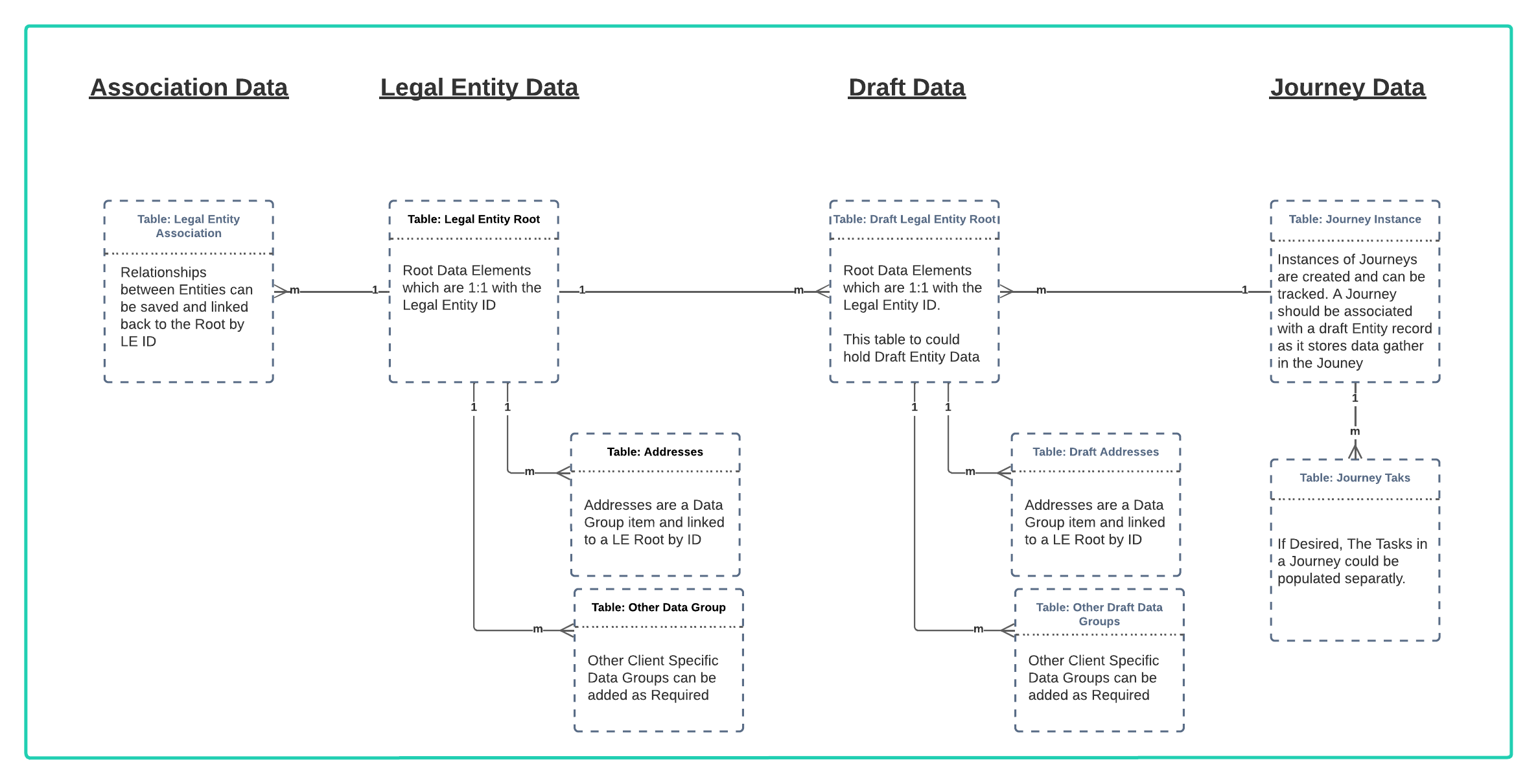 A client may have a requirement to have ALL information from the fenergo SaaS Platform to query and aggregate with other data sources inside their own technical landscape. We do not provide a mechanism to download a full copy of data therefore it is advisable to focus on syncing against events which allow all the Legal Entity and Journey information to be retrieved in near real time as it is updated. Lets examine a simple use case below: