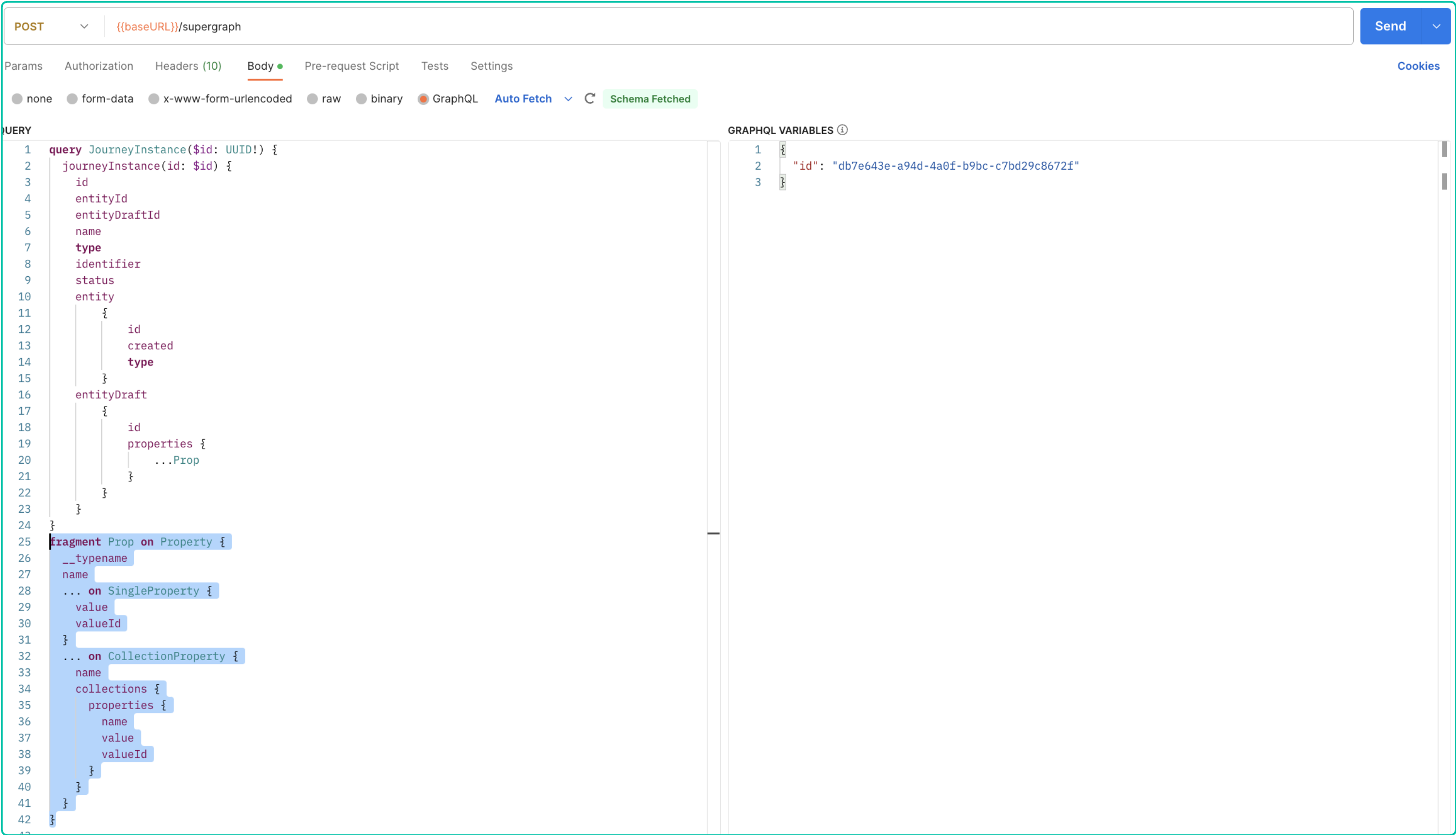 As a convenience, GraphQL allows you to parameterize queries and also define fragments which can be re-used within your query. These keeps the query clean and neat but also make queries easier to read and reuse. Look at the below illustration on postman, which uses a parameter for the JourneyInstanceId on line 2. Also a fragment to iterate the generic properties is defined. This helps as many Types will return a collection of properties.