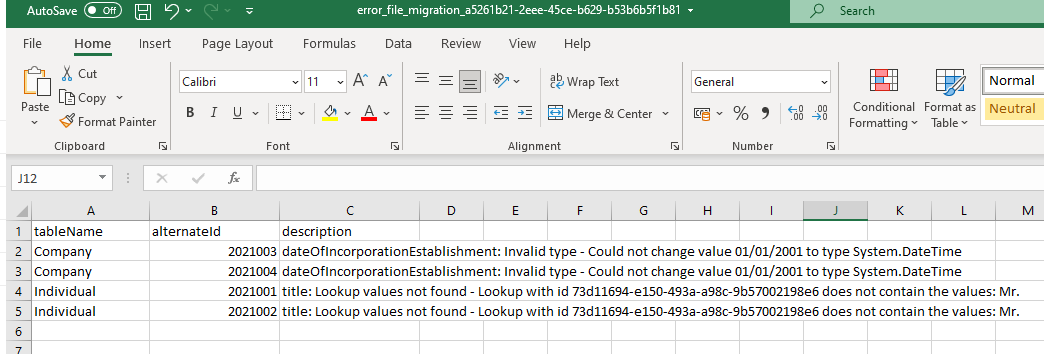 In this case, there are errors with both Company and Individual Data. The Date format provided is not correct, the date must be in a compatible format.
