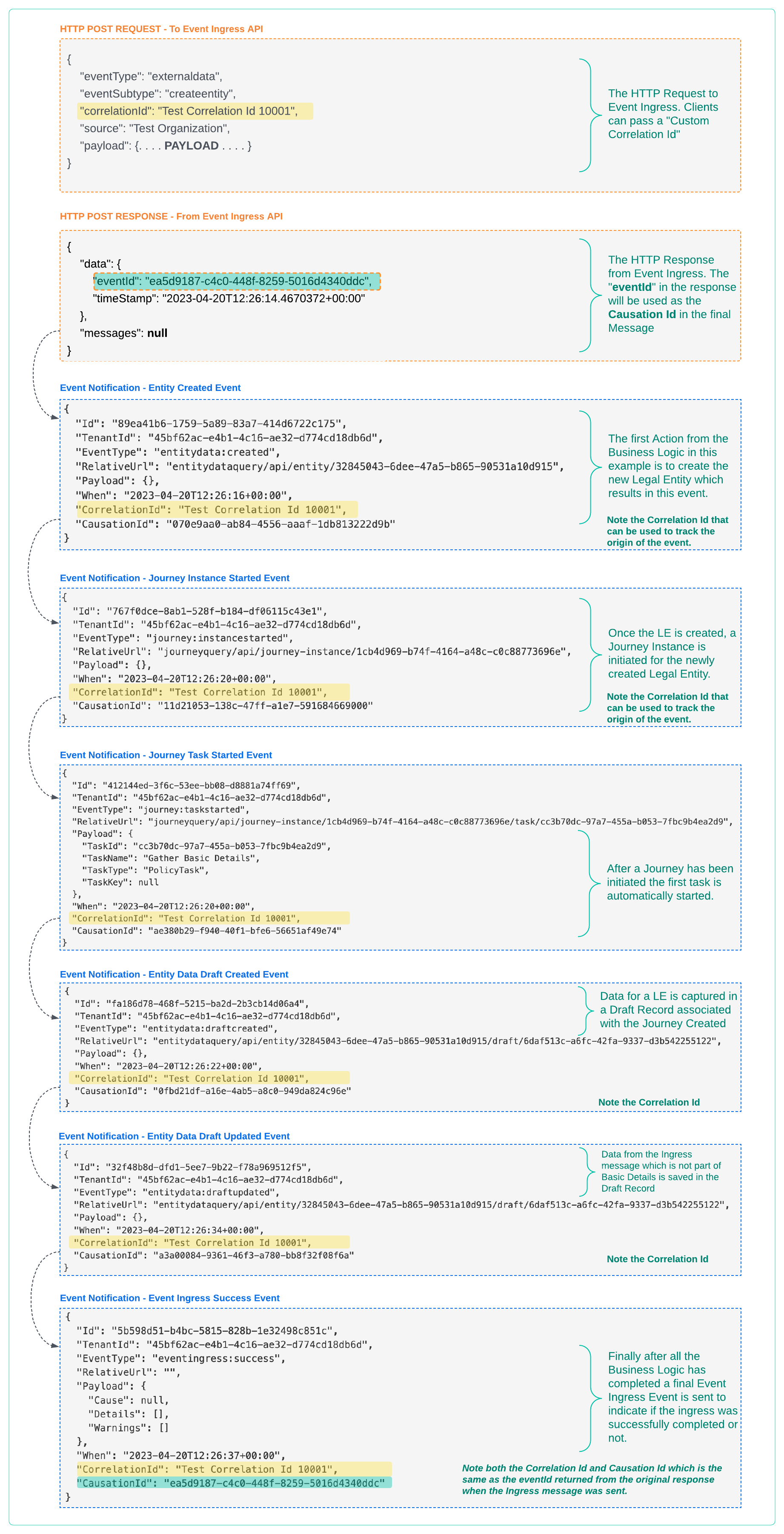 So when a new legal entity is created, the "entitydata:created" event is generated and sent to configured webhook endpoints (or can be polled for). In the below example which looks at the Event Ingress Request and Response, ALL of the Generated Events are identified and it can be see how the Correlation Id and Causation Id can be used for clients to track the origin of the Events. This could be used to differentiate between Ingress activity and normal system usage or whatever the client requirements are.