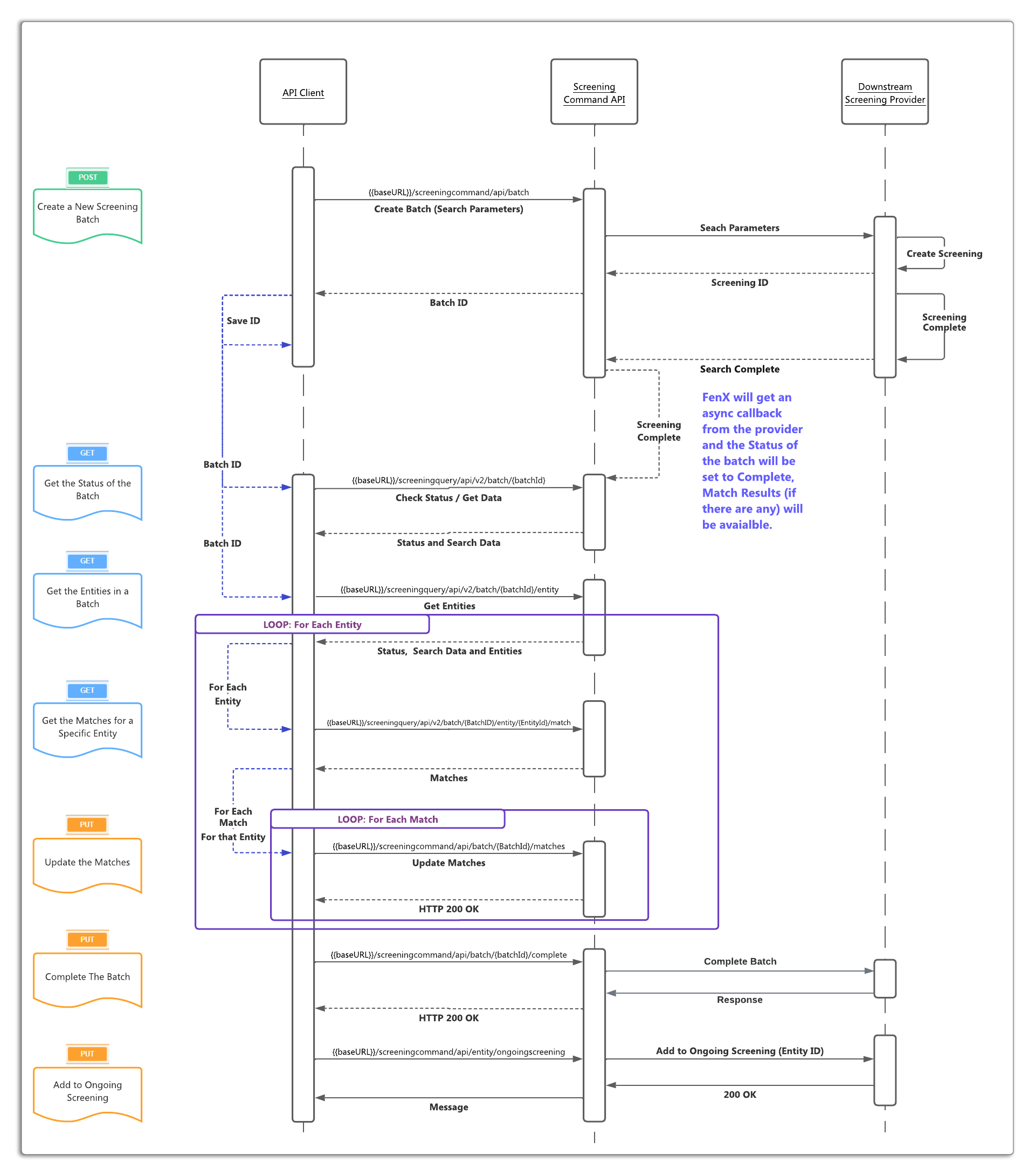 If a Journey has been configured with a Screening Task, the API methods mentioned have variations to track against a journey. In this scenario, it can be assumed that the batch creation process is handled automatically via the journey and potentially the API may just be used to retrieve or update screening match results.