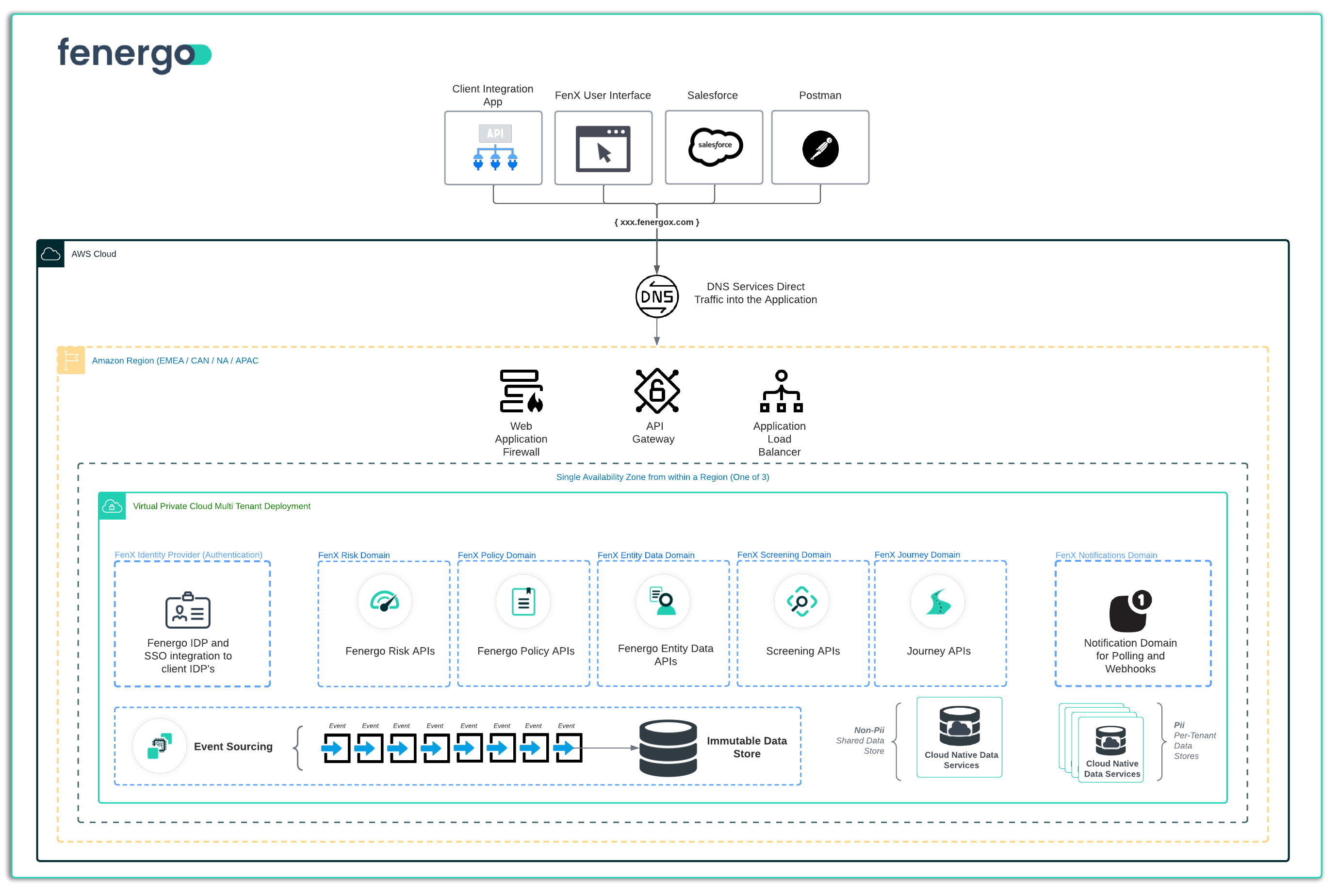Some of the concepts assume a basic understanding of how networking and resilience is achieved on the cloud. Fenergo follow the best practice guidelines from AWS including the 6 pillars of the AWS Well Architected Principals. Learn more about AWS Well Architected. Our clients can choose one of the regions where we have deployed and each of our deployments spans 3 Availability Zones within those regions. Learn more about AWS Global Infrastructure