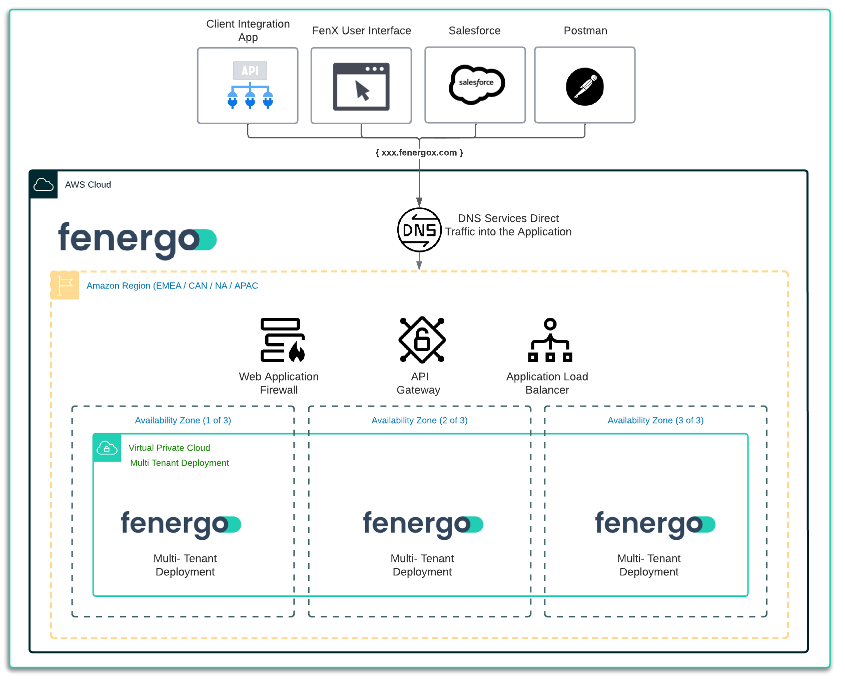 DNS Services: Amazon provides a way for Fenergo to map the URL endpoints into the private hosted cloud space so when clients access main endpoints such as app.fenergox.com they are brought to the login / authentication portion of the application.