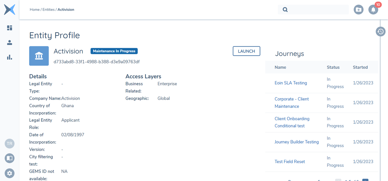 In the Journey Hub, there is a Navigation Breadcrumb available to help users get from Task screens back to the Journey Hub easily. Previously, users could only use this Breadcrumb to navigate from a Task to either the Journey Hub or Team Management Dashboard, but not the legal entity itself, which was a limiting experience. It meant an additional click for the user to go to the Journey Hub before clicking on the Legal Entity Name to take them to the Legal Entity Profile Page for that legal entity.