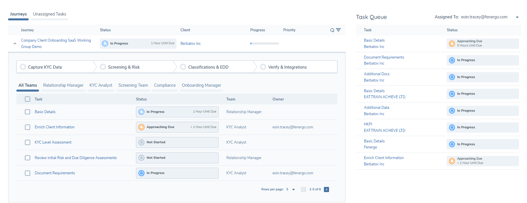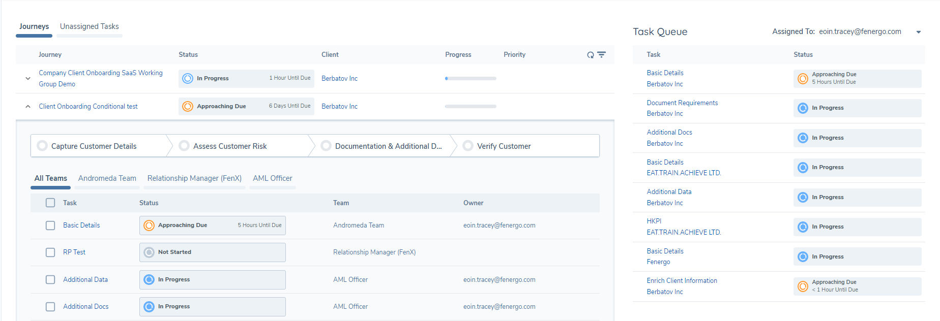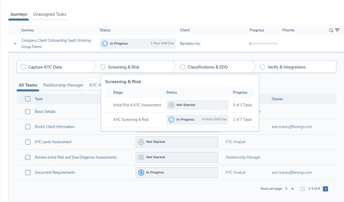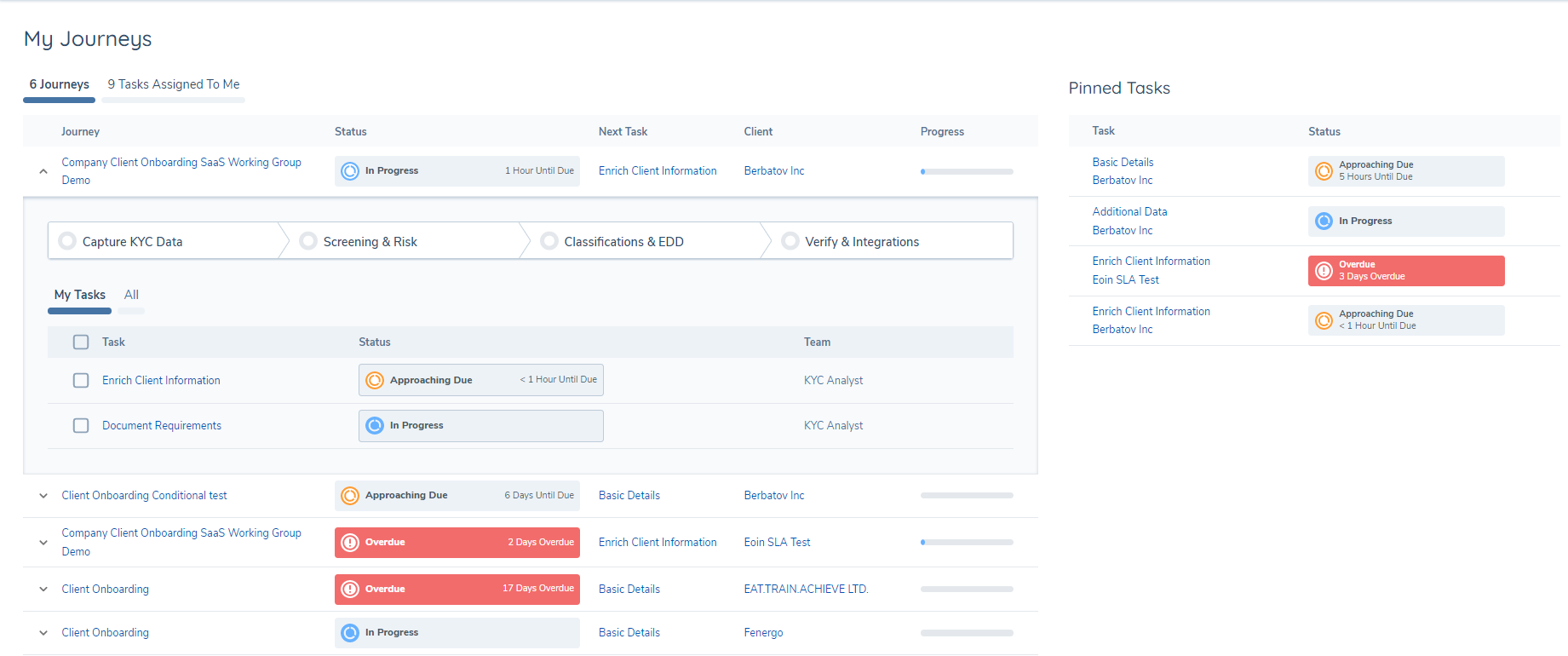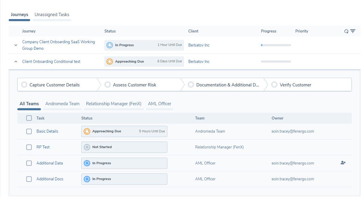 • The Journey Hub , where instances of Journeys are presented for teams to process onboarding, maintenance, reviews, and other CLM activities. This is the operational view that is used by onboarding teams.