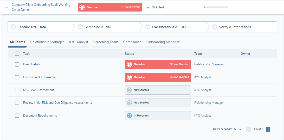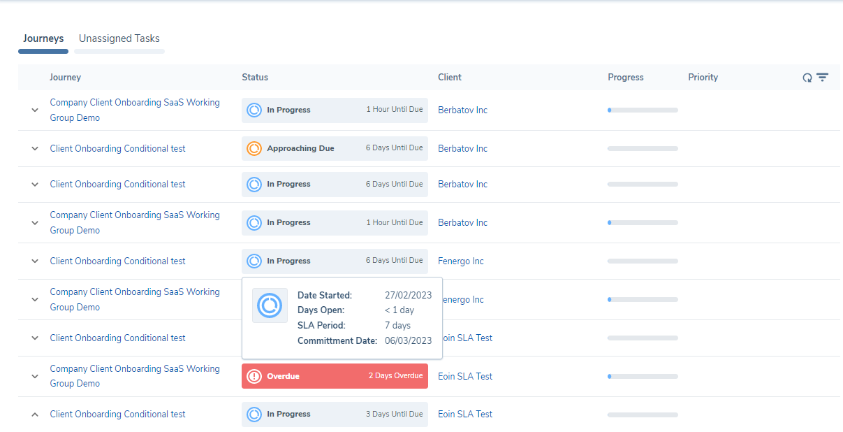 Once these SLAs have been set within a Journey Schema and this Journey has been launched for a legal entity, users will be able to see the reflected SLAs displayed in their Dashboards (Team Management and My Journeys). The SLA for a Task, Stage or Journey will be calculated when the item moves to a status of In Progress. This ensures we only begin the calculation of a SLA, relative to when the work item was available to be worked on by a User.